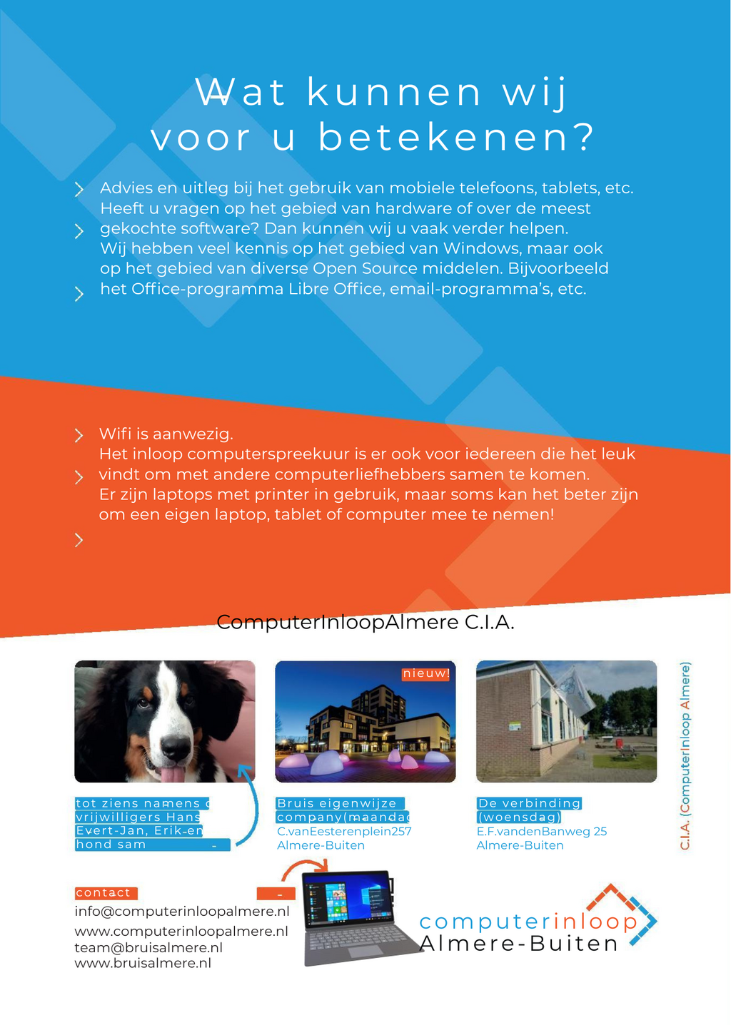 Bij Computerinloop Almere zetten we ons in om technologie toegankelijk te maken voor iedereen. Onze team van vrijwilligers biedt gratis ondersteuning, zodat jij je geen zorgen hoeft te maken over IT-vragen. Samen maken we de wereld van technologie begrijpelijker!